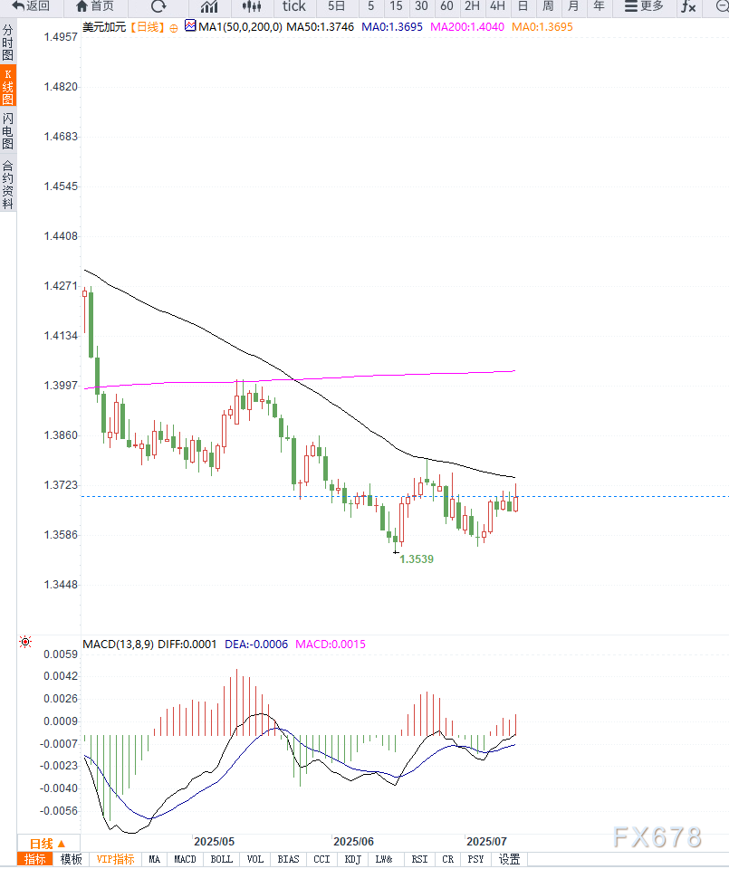 特朗普宣布35%高关税施压加元,美元兑加元反弹至密集压力区间