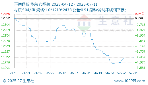 据生意社价格监测,本周不锈钢价格小幅下跌。截止7月11日,现货304/2B不锈钢平板1.0*1219*2438(公差0.91)的日均价为现报价11850元/吨,较周初下跌0.06%,同比下跌8.54%。