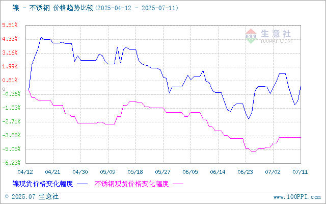 据生意社价差分析工具显示,镍和不锈钢价格基本相似,近期不锈钢价格稳为主,镍价小幅下跌。