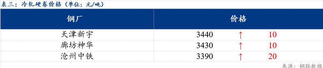 今日北方市场冷轧基料3.0*1010*CSPHC河北普阳价格为3200元/吨,较上一期价格上涨10元/吨,河北纵横价格为3210元/吨,较上一期价格上涨10元/吨。镀锌方面,今日北方市场民营钢厂出厂价格整体上涨10-60元/吨。轧硬方面,当前主流报价3390-3440元/吨。市场方面,现货市场商家报价跟随热卷期货盘面价格上涨,整体成交氛围热络,加上宝钢出台镀锌期货价格上涨100元/吨的政策提振了市场信心,现货市场商家情绪面有一定带动,华北市场贸易商大户日成交在600吨左右。