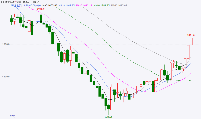 焦炭期货涨势延续,盘中刷新逾两个月高位,焦炭收涨于1519.5元/吨,涨幅收至2.81%。