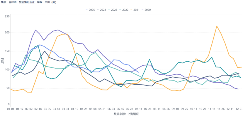 (3)本周黑链市场延续回暖态势,钢厂在原料采购端的热情有所升温,不过独立焦化企业的开工节奏并未出现显著调整。库存层面呈现分化特征:焦炭库存环比下降8.83%至93.08万吨,创下年内新低;钢厂焦炭库存小幅回升至637.8万吨,港口焦炭库存则增加13.66万吨。整体来看,本周焦炭综合库存较上周增长近5万吨,达到986.56万吨。