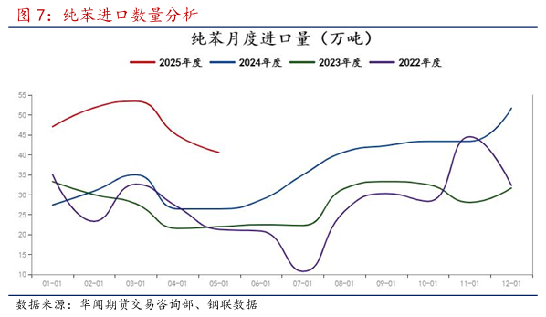 2025年从纯苯进口数据来看,上半年同比进口量增长明显。前5个月累积进口237.6万吨,较去年同期的146.1万吨增加91.48万吨,同比增长62.6%,进口数量大幅增多导致国内纯苯供应过剩,是纯苯价格下跌的重要原因。