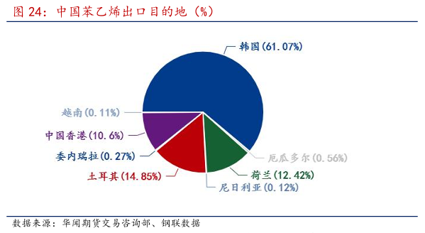 从苯乙烯出口目的地来看,前五个月累计出口的苯乙烯中,约6成出口至韩国,14%出口至图尔区,12%出口至荷兰。