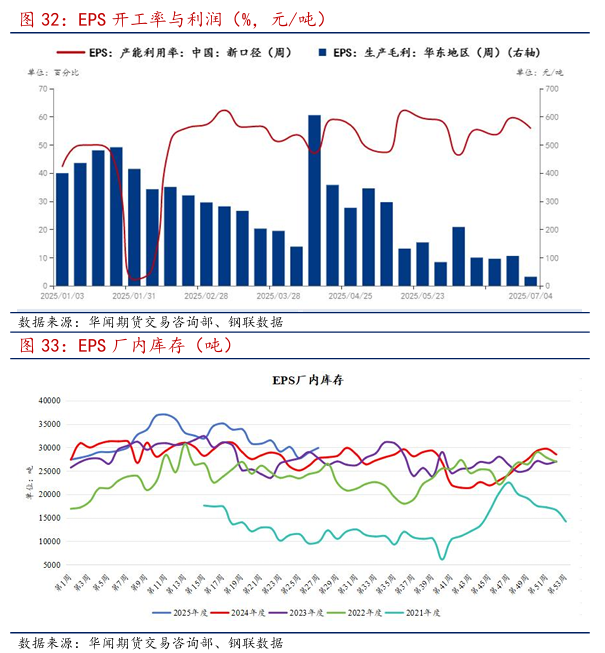 EPS开工及利润方面,上半年开水平处于近几年同期高位,EPS利润水平整体较好,装置开工积极性较高,但近期开工利润逐渐被压缩,或将打击EPS开工积极性。库存方面EPS上半年库存持续处于同期高位,考虑到利润水平较好,供应持续维持高位,下游需求维持高位刚需,尤其是天气炎热后,生鲜保温箱需求增多,进一步带动了对EPS的需求,EPS库存震荡去化。