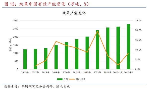 纯苯开工率方面来看,下半年预计开工率维持在75%-80%之间的水平,在国内供应维持稳定的状况下,纯苯显性库存去化依赖于进口纯苯减少。从纯苯生产毛利来看,上半年纯苯利润整体处于近几年同期低位,近期纯苯毛利在737元/吨,虽然利润受到压缩,整体仍支持纯苯的开工。展望2025年下半年纯苯产能,据隆众资讯,现有纯苯装置投产计划显示,下半年将有46万吨纯苯产能投产,年末纯苯产能或将达到2676万吨。
