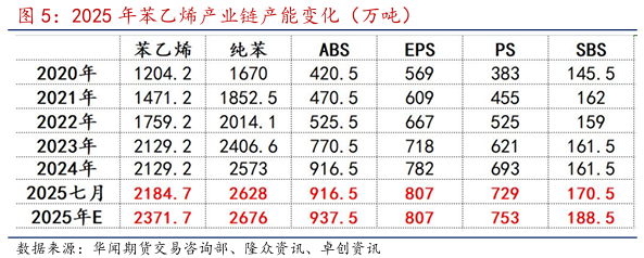 2025年上半年苯乙烯装置产能为2184.7万吨,暂无新装置投产。根据投产计划,预计2025年全年苯乙烯产能新增加187万吨,同比增长11.38%,2025年底中国苯乙烯产能或将达到2371.7万吨,随着下半年产能的投入,苯乙烯供需偏紧的格局或将得到一定的改善。