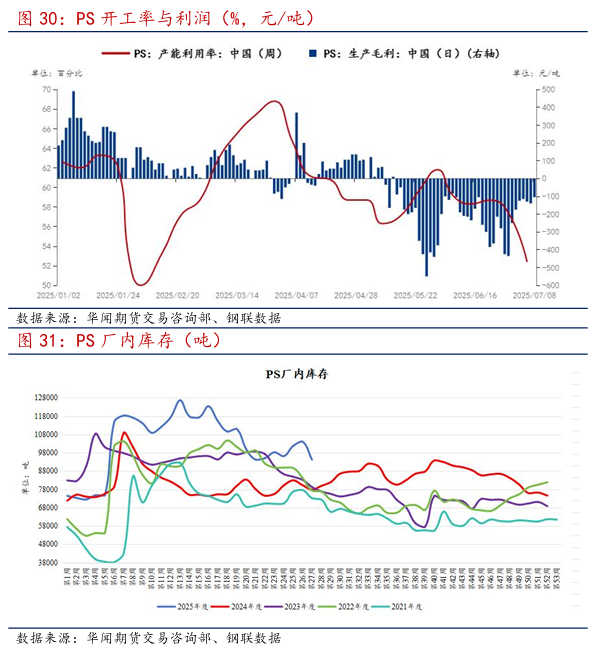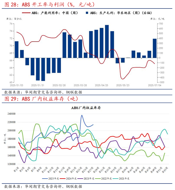 下游PS(聚苯乙烯)的利润及开工来看,年初至五月中旬前PS大多数时间里均有利润,PS开工积极性较高,PS产能与ABS类似,前期产能投产过多,供应端压力整体偏高,厂内库存持续维持同期高位,去化困难,近期PS生产利润亏损,进一步加速了PS的开工下滑,PS库存去化、生产利润修复后开工率或再次回升,从今年家电排产数据来看7、8月份排产同比下滑较为明显。