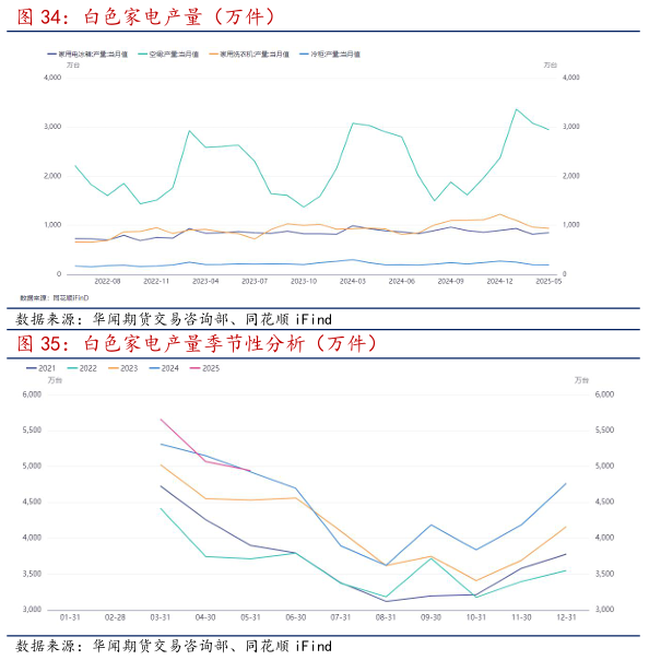 从终端需求来看,苯乙烯下游的白色三大件,空调、冰箱、洗衣机,2025年上半年季度产量同比明显增长,其中空调及洗衣机的产量增长较为突出,随着国补政策的持续发力,预计下半年白色家电产量或将继续维持高位。