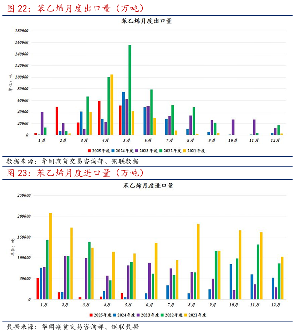 展望下半年,随着苯乙烯三套装置的投产,基于低价的纯苯的情况下,非一体化装置开工率升高,下半年苯乙烯供应整体趋于宽松,进口大概率将同比下滑,而出口则会呈现出同比增长的状态,后市需要关注纯苯的价格变化。