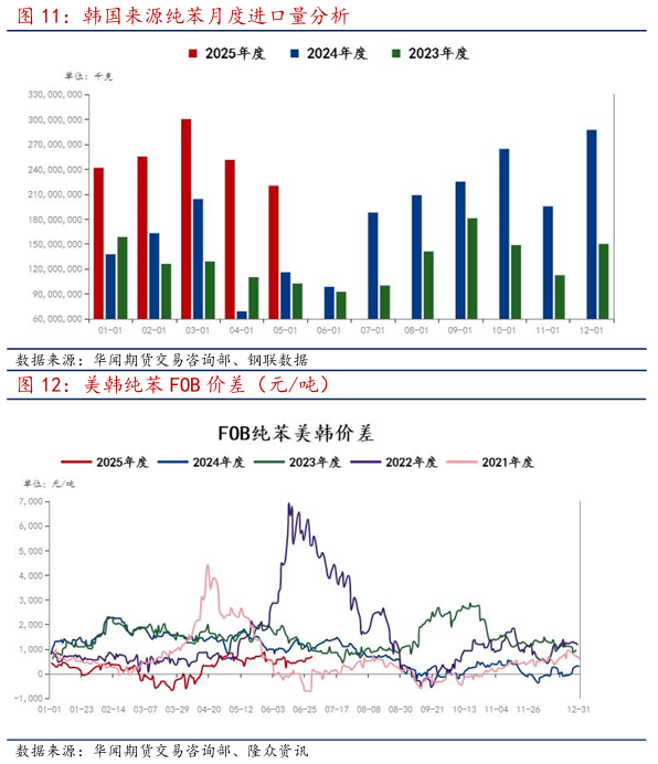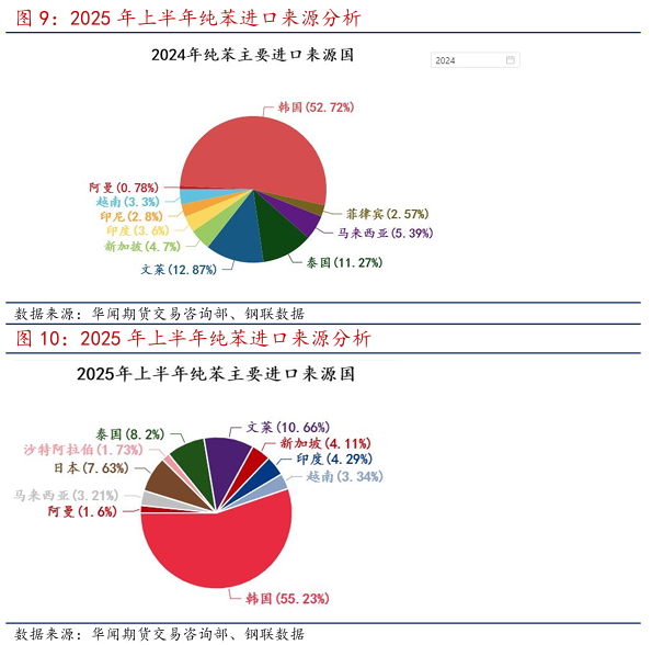 2025上半年,韩国是我国最大的纯苯进口来源国,占纯苯进口总量的55,23%,较2024年的52.72%有明显的增多。此外,今年上半年日本出口至我国的纯苯量也有大幅增多,由去年的低位增长至今年的7.63%。日韩对我国纯苯的出口量大幅增多主要愿意为美韩纯苯价差水平为近几年同期低位,套利窗口关闭,而另一方面,美国对日韩加征关税,导致纯苯出口到美国的经济性进一步降低,后续需要关注2025年下半年,美国对日韩的关税政策,若继续维持偏高关税,且纯苯低价差,国内纯苯进口压力依旧会偏大。除此之外,文莱、泰国也都是重要的进口来源地。