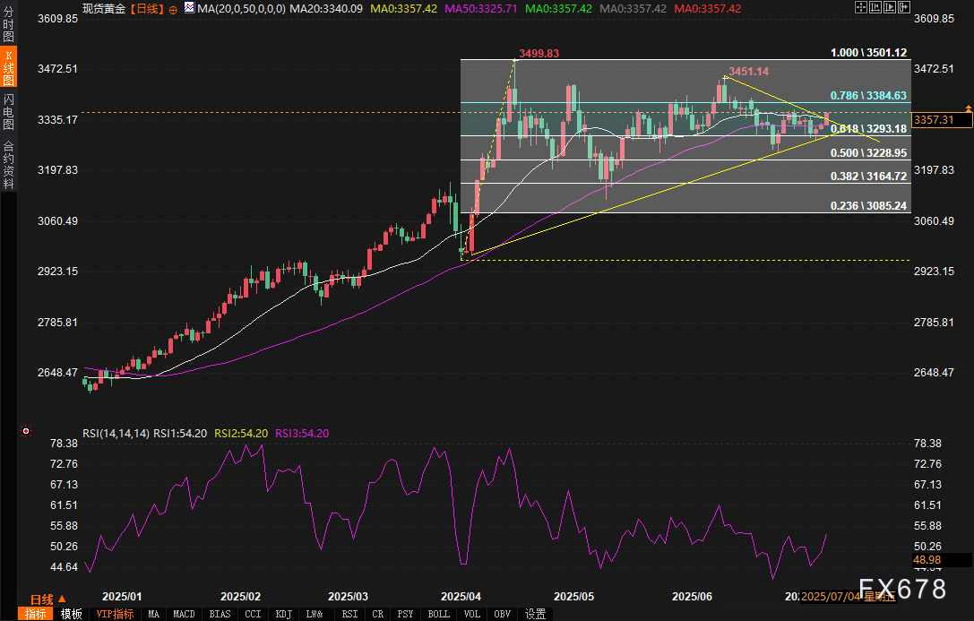 从技术面来看,黄金(XAU/USD)在本周展现出显著的上涨动能。日线图显示,黄金价格成功突破对称三角形阻力,触及20日简单移动平均线(SMA),即3339.97美元。这一突破标志着短期技术形态的转强,显示多头力量占据上风。相对强弱指数(RSI)在日线图上回升至53附近,且呈上升趋势,表明市场存在轻微的看涨动能。然而,短期内黄金的上行空间可能受到23.6%斐波那契回撤位(3372美元)的限制。若能突破这一水平,3400美元的心理关口以及6月高点3452美元将成为下一目标。