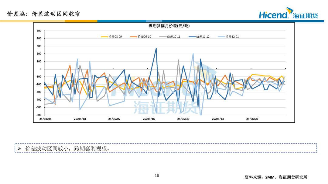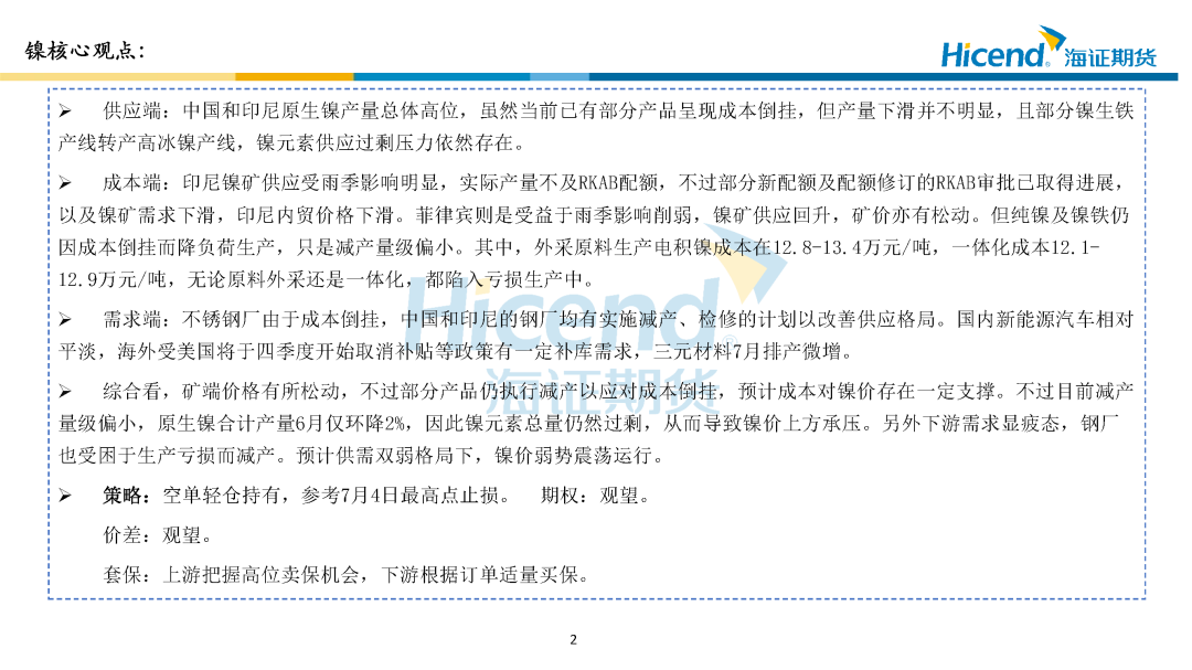 综合看,矿端价格有所松动,不过部分产品仍执行减产以应对成本倒挂,预计成本对镍价存在一定支撑。不过目前减产量级偏小,原生镍合计产量6月仅环降2%,因此镍元素总量仍然过剩,从而导致镍价上方承压。另外下游需求显疲态,钢厂也受困于生产亏损而减产。预计供需双弱格局下,镍价弱势震荡运行。策略:空单轻仓持有,参考7月4日最高点止损。期权:观望。