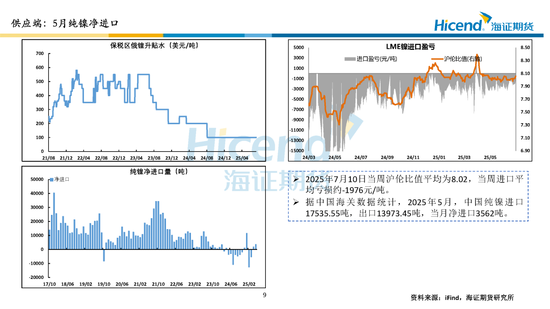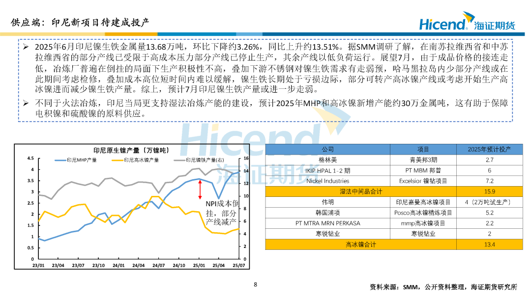 供应端:中国和印尼原生镍产量总体高位,虽然当前已有部分产品呈现成本倒挂,但产量下滑并不明显,且部分镍生铁产线转产高冰镍产线,镍元素供应过剩压力依然存在。