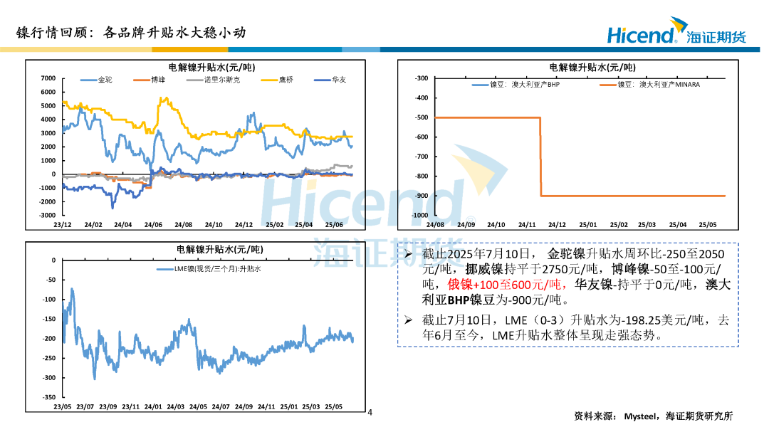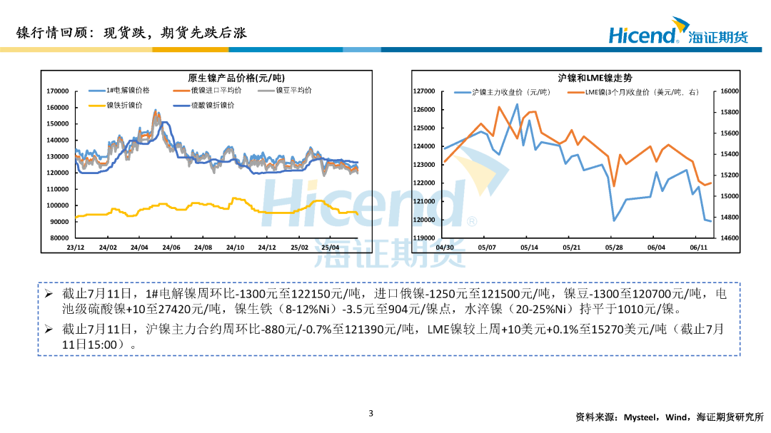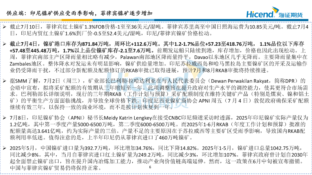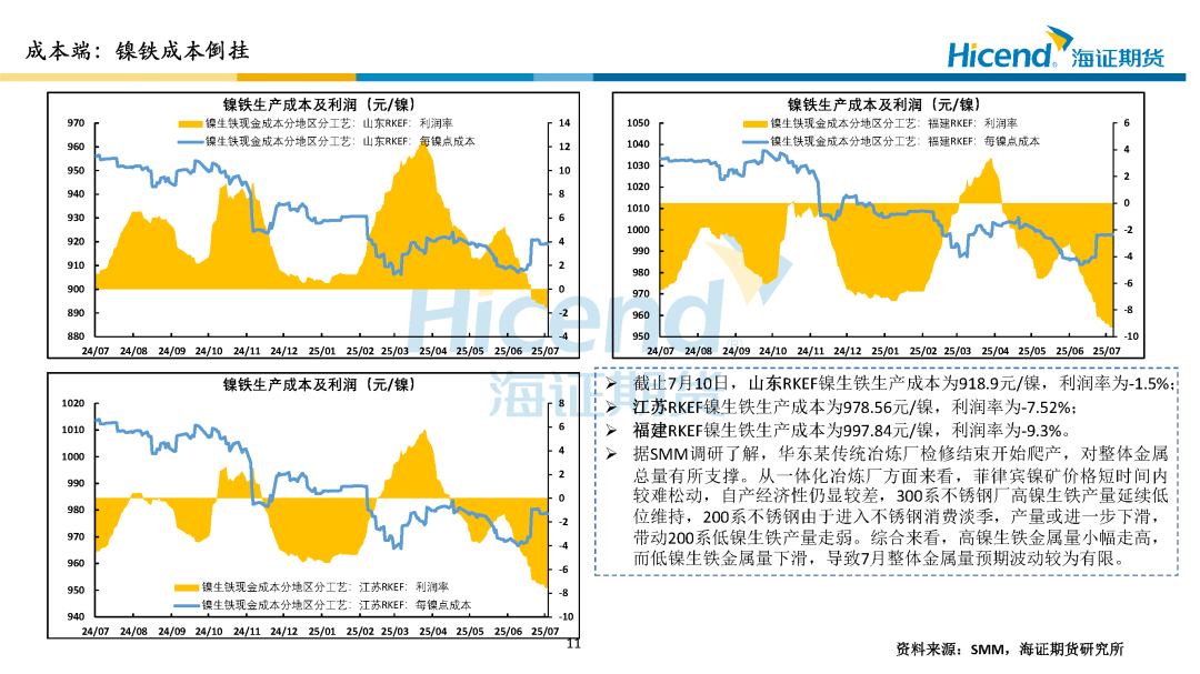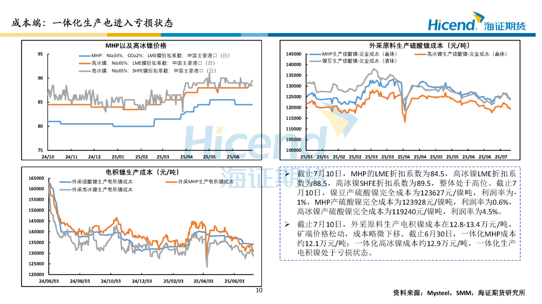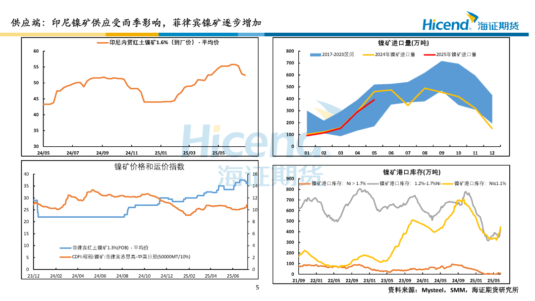 成本端:印尼镍矿供应受雨季影响明显,实际产量不及RKAB配额,不过部分新配额及配额修订的RKAB审批已取得进展,以及镍矿需求下滑,印尼内贸价格下滑。菲律宾则是受益于雨季影响削弱,镍矿供应回升,矿价亦有松动。但纯镍及镍铁仍因成本倒挂而降负荷生产,只是减产量级偏小。其中,外采原料生产电积镍成本在12.8-13.4万元/吨,一体化成本12.1-12.9万元/吨,无论原料外采还是一体化,都陷入亏损生产中。
