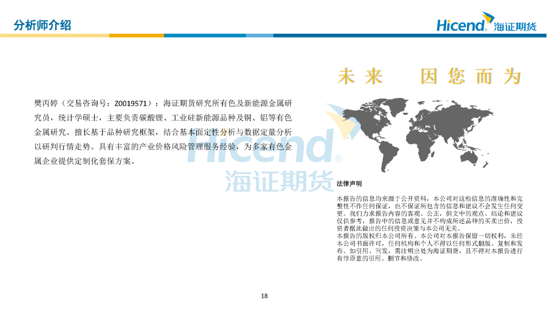 樊丙婷(交易咨询号:Z0019571):海证期货研究所有色及新能源金属研究员,统计学硕士,主要负责碳酸锂、工业硅新能源品种及铜、铝等有色金属研究。擅长基于品种研究框架,结合基本面定性分析与数据定量分析以研判行情走势。具有丰富的产业价格风险管理服务经验,为多家有色金属企业提供定制化套保方案。
