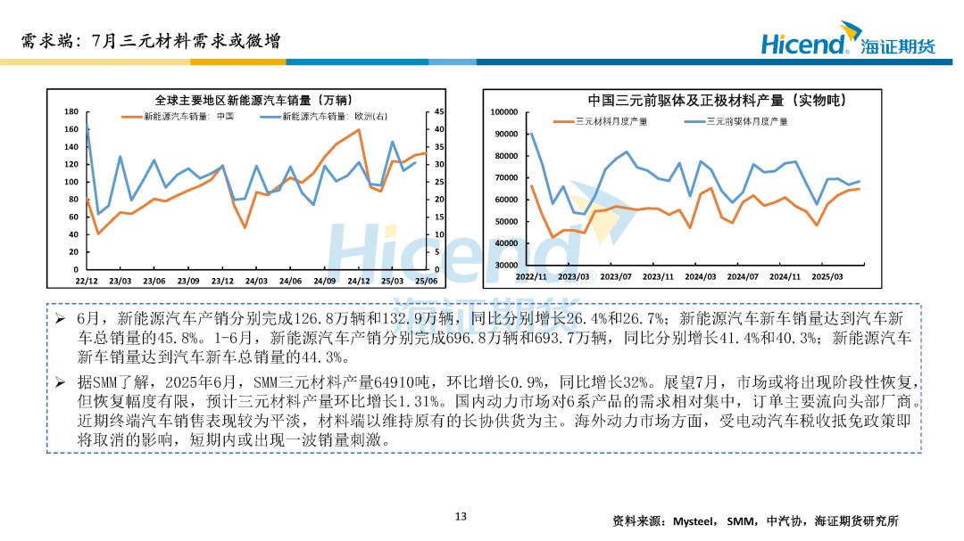 需求端:不锈钢厂由于成本倒挂,中国和印尼的钢厂均有实施减产、检修的计划以改善供应格局。国内新能源汽车相对平淡,海外受美国将于四季度开始取消补贴等政策有一定补库需求,三元材料7月排产微增。
