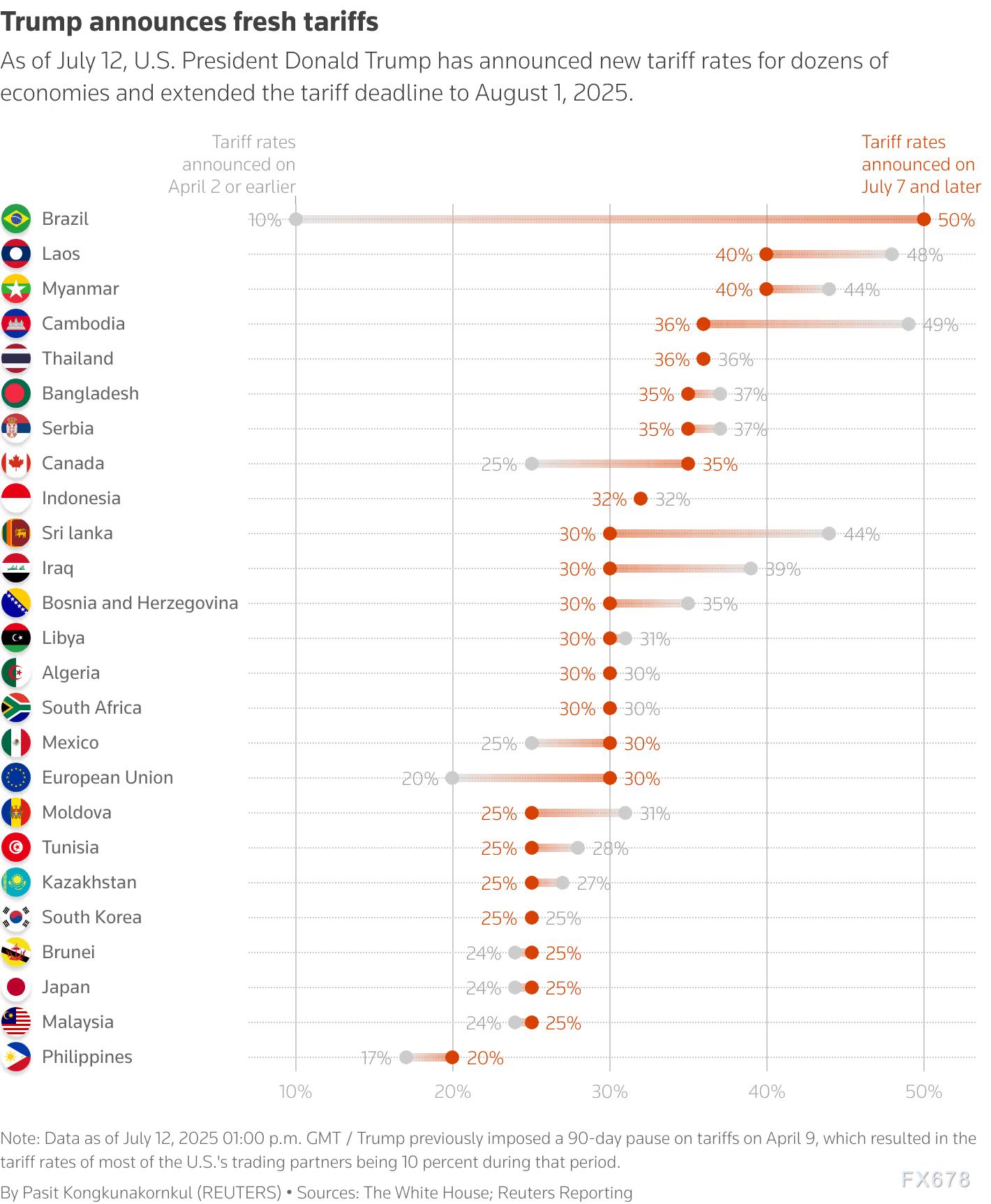 特朗普上周向包括加拿大、日本和巴西在内的其他 23 个贸易伙伴发出了类似信函,设定了从 20% 到 50% 不等的关税税率,并对铜征收 50% 的关税。