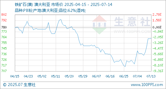 7月14日生意社铁矿石(澳)基准价为762.89元/吨