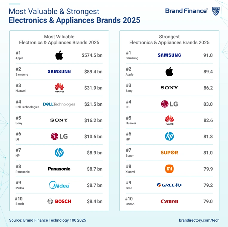 BrandFinance公布2025全球科技品牌价值榜:苹果、微软、谷歌蝉联前三,英伟达增长最快