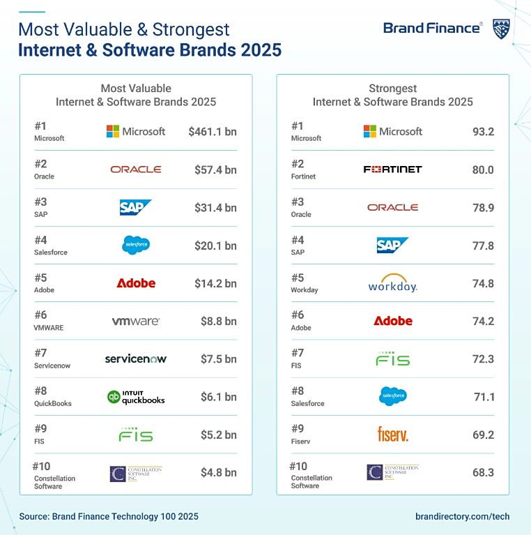 微软、谷歌、亚马逊和 TikTok / 抖音在 2025 年保持了 2024 年的排名,分别位列品牌价值第二至第五位。