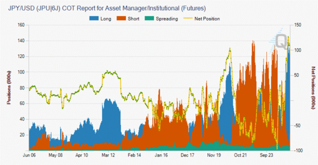 图:CFTC的数据显示(黄线),去年8月做空日元的头寸达到历史之最,而如今极端反向,做多日元的头寸也达到了历史之最
