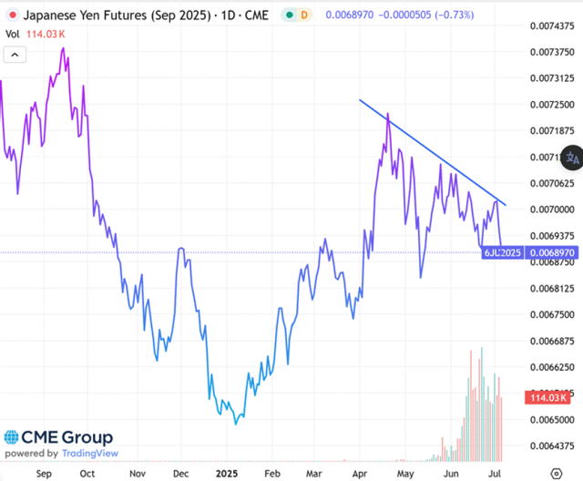 短期利率的回升也使得美元受益。目前美元兑日元已被压制在了趋势线以下(下图蓝线)。
