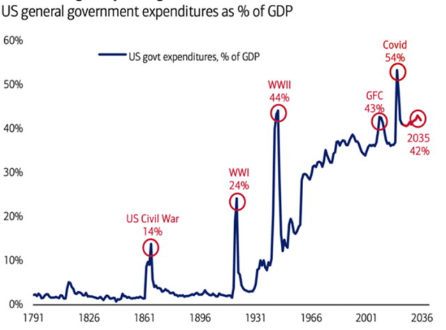 图:美国广义政府支出占其GDP比重已经重回二战和08金融危机水平