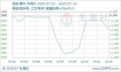 据生意社商品行情分析系统显示:7月以来,豆粕行情弱势振荡为主,价格小幅下跌。7月1日,豆粕市场均价2930元/吨,7月14日,豆粕市场均价2912元/吨,下跌0.61%。