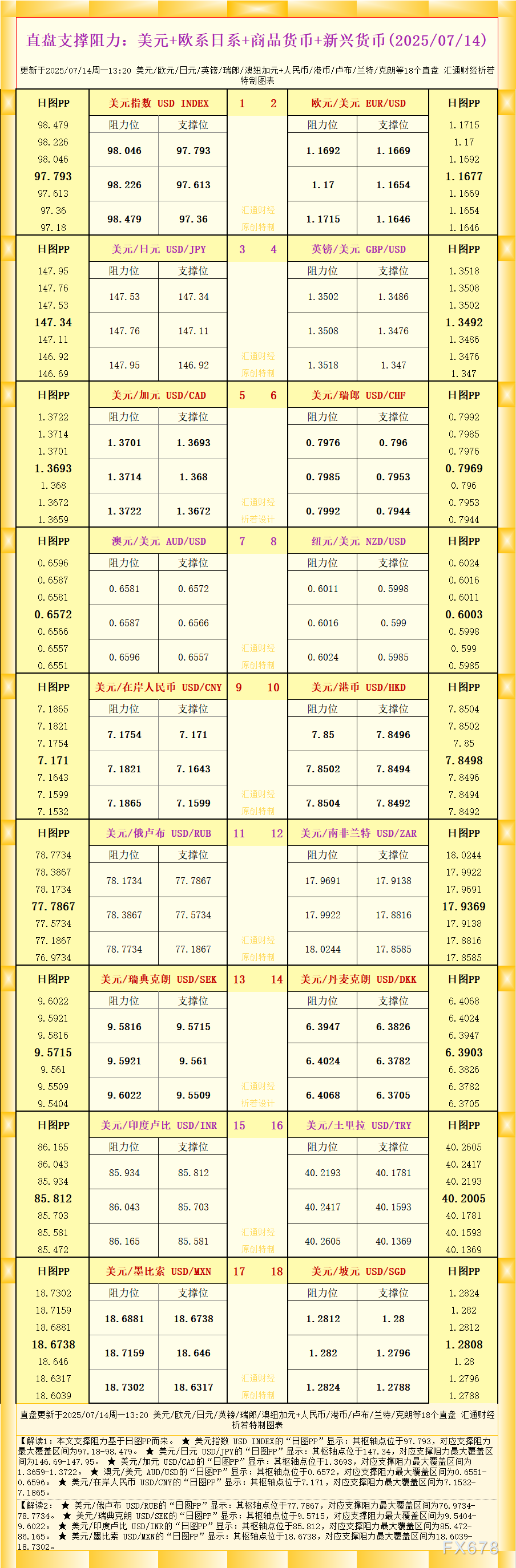 一张图看18个直盘外汇支撑阻力:美元+欧系日系+商品货币+新兴货币(2025年7月14日)