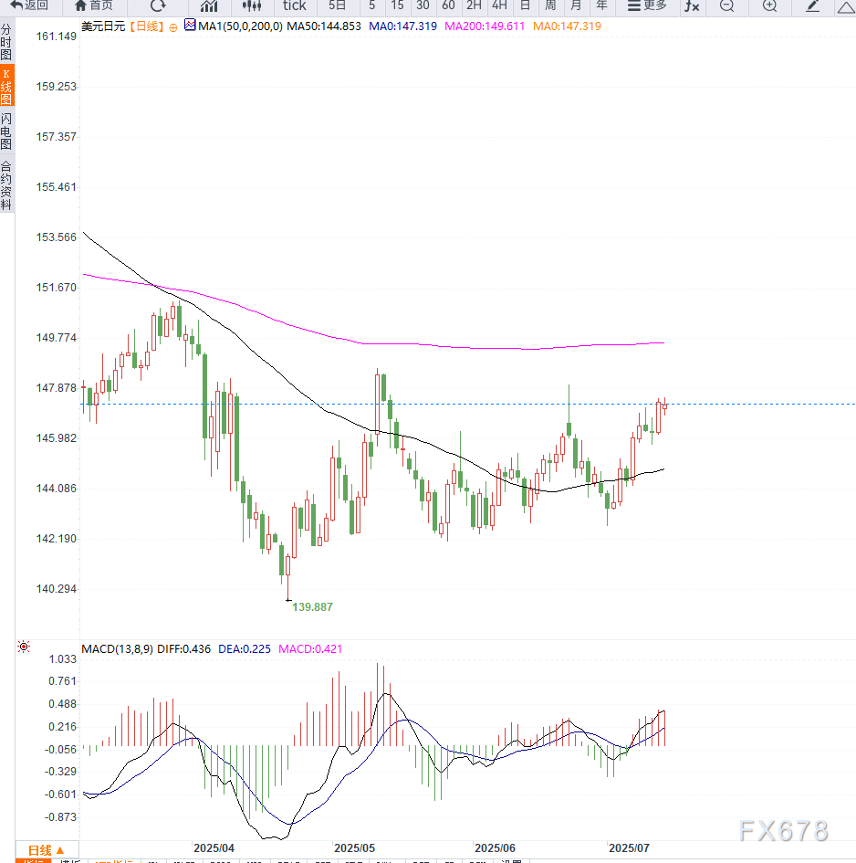 当前价位若能有效站稳147.50-147.55区域,将为挑战148.00整数关口(6月高点)提供基础。若继续突破,可能延续升势至148.65(5月高点),并进一步测试149.00心理关口。
