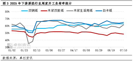 市场供应压力不减,纸浆需求端表现亦不容乐观。截至7月10日,双铜纸开工负荷率在62.60%,环比上周持平;木浆双胶纸开工负荷率在48.25%,环比上周下降0.85个百分点;木浆生活用纸开工负荷率在61.51%,环比上周上涨4.44个百分点;白卡纸开工负荷率在64.68%,环比上周上涨1.01个百分点。下游原纸企业开工积极性提升相对有限,木浆延续逢低、刚需询单节奏,后市预期谨慎下,原料备货积极性难有提升,牵制浆市需求放量相对有限。