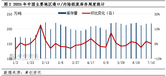 纸浆供应方面,国外浆厂生产及发运较为正常,且芬兰芬林集团宣布凯米纸浆厂及其毗邻的造纸厂将于7月4日恢复生产,将进一步提高纸浆市场供应压力。国内供应方面来看,由于目前仍处于需求淡季,港口纸浆库存去化节奏偏缓,整体水平仍维持近年来高位。据卓创资讯数据监测显示,截至7月10日,中国主要地区及港口周度纸浆库存量218.57万吨,呈现连续两周累库状态。