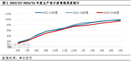 卓创资讯监测主产省1-5月份小麦售粮进度皆慢于近年水平,截至2025年5月底2024年产小麦售粮进度在94%,较上年同期偏慢5个百分点,市场仍有一定余粮。与此同时,上半年亦是轮换小麦集中投放期,对小麦市场供应起到有效补给作用。加上2025年主产区多地存在新麦提前上市现象,新陈过渡顺畅,并未出现明显供应紧张局面,及至6月新季小麦集中收获,供应压力明显。