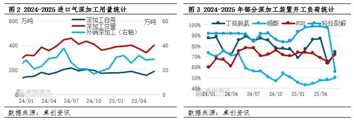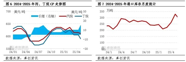 根据卓创资讯数据统计,2025年6月多数深加工装置开工负荷呈现上行趋势,主要是由于关税缓和后,业者对原料的担忧逐渐减少,企业开工负荷较前期提升明显,但轻烃裂解由于某单位停工,开工负荷下降明显。总体来看,月内进口丙烷以及丁烷需求均有增加,但丁烷受丁烷脱氢以及顺酐装置开工负荷同时提升影响,丁烷深加工需求大于丙烷深加工需求。