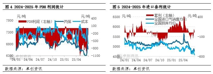 从国内前期套利来看,6月进口销售套利空间由关闭转为开启,但PDH装置利润仍呈现负向加深趋势。6月上旬国际现货受国际局势扰动影响,现货成交价格居高不下,下旬国际争端缓解,原油价格回落也直接牵制国际成交重心下移。由于国内6月燃气销售表现欠佳,进口套利情况虽有改善,但整体盈利幅度有限。PDH装置利润上旬负向加深趋势更加明显,下旬虽有好转,但整体套利仍不甚乐观。套利情况表现一般,也成为影响业者采购动力的重要因素。