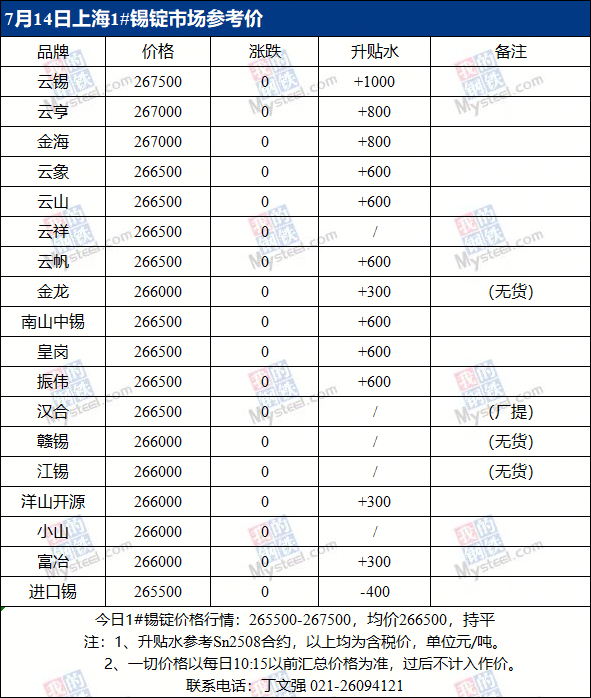 7月14日Mysteel上海现货锡锭报价265500-267500元/吨,均价266500元/吨,较上一交易日持平。Mysteel15:30上海现货锡锭成交价格265000-267000元/吨,均价266000元/吨,较上一交易日涨1000元/吨。