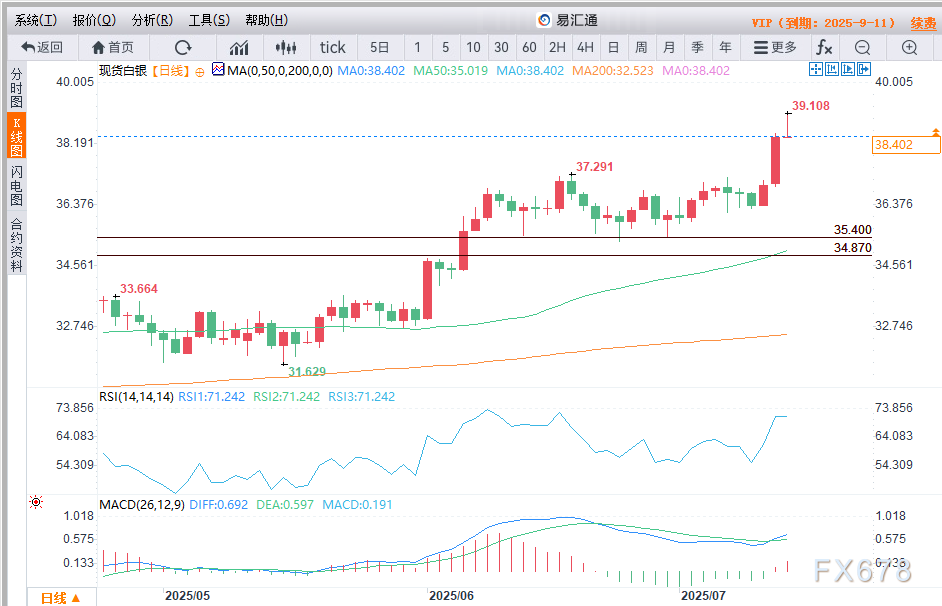 周一(7月14日),白银价格大幅反弹,突破2011年以来的最高水平,且表现远超黄金。亚盘早段,白银一度飙升至39.13美元的峰值,随后回落至38.41美元附近,持平于开盘价。尽管出现部分获利了结,但白银仍能保住大部分涨幅,这反映出强劲的潜在需求,并强化了看涨前景。