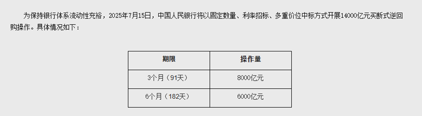中国人民银行7月14日消息,为保持银行体系流动性充裕,7月15日,中国人民银行将以固定数量、利率招标、多重价位中标方式开展14000亿元买断式逆回购操作,其中3个月(91天)期限为8000亿元、6个月(182天)期限为6000亿元。