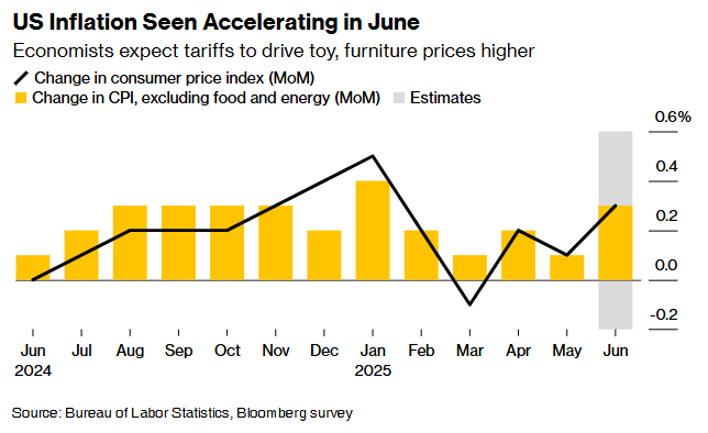 经济学家长期以来一直警告称,关税将推高美国通胀。即将公布的消费者物价报告将检验他们的判断是否准确。在连续四个月高估消费者价格指数(CPI)之后,预测人士预计美国劳工统计局在周二发布的6月CPI数据将显示通胀加快;家具、玩具和娱乐商品以及汽车等受关税影响的品类价格上涨预计将结束此前一系列温和的物价数据。