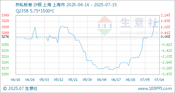 7月15日,生意社热轧板卷基准价为3333.33元/吨,与本月初(3210.00元/吨)相比,上涨了3.84%。