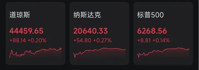 当地时间周一,美股三大指数集体收涨,纳指再创历史新高。截至收盘,道指涨88.14点,涨幅0.20%,报44459.65点;纳指涨54.80点,涨幅0.27%,报20640.33点;标普500指数涨8.81点,涨幅0.14%,报6268.56点。