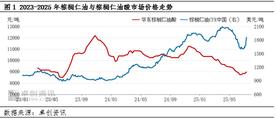 2025年来看,对仁油酸市场来说,相较于与原料棕榈仁油市场的价格偏离度,其与相关产品棕榈油酸的价格相关性明显更高,至少在趋势上呈现高度一致性,即两者上半年均呈震荡下跌走势。因指标相近,下游部分行业客户通过棕榈油酸对棕榈仁油酸的替代增加。而上半年棕榈油酸价格在原料棕榈油市场的成本驱动下阴跌不断,也对棕榈仁油酸价格产生较强拖累。但6月份,棕榈油价格筑底走强,棕榈油酸成本端存在提振,且国内棕榈油酸前期成交明显放量带动部分库存出清且存在一定交货压力,综合导致商家调涨棕榈油酸价格,棕榈仁油酸市场所受的拖累减弱、跟随向上。