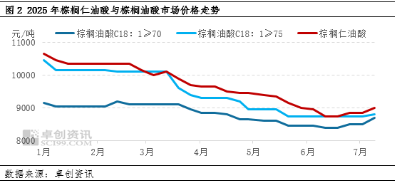 6月下旬,棕榈仁油市场因为需求放量,价格筑底后快速拉升。截至7月14日,CFR中国棕榈仁油市场商谈在1900美元/吨,较7月初上涨295美元/吨,涨幅18.38%。棕榈仁油市场上涨对仁油酸市场的成本端提振有所增强。但通过图1可以看出,仁油对仁油酸的成本驱动并不十分紧密,特别是2024年下半年,仁油走高对仁油酸的提振力度有限,2025年上半年,仁油价格阶段性走强更是难以扭转油酸市场的颓势。所以,此轮市场走高在原料仁油价格走强的提振之外,更在于油酸供需面压力减轻。