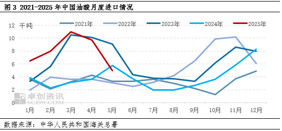 在替代需求拖累减弱之外,油酸自身供应压力也有所下降。据海关数据,2025年1-5月,中国油酸累计进口4.03万吨(参考2024年全年油酸进口量为4.7万吨)。其中2024年12月至2025年4月期间,油酸月度平均进口量为0.87万吨,普遍处于近五年偏高水平。与此同时,国内仁油酸装置虽偶有停机检修,但国产货源供应也整体宽松。综上,供应端出货压力也是市场此前连续下跌的因素之一。直到5月,中国油酸进口量降至0.5万吨/月,6月下游集中择低补货也带动供应端压力减轻,市场价格支撑增强。