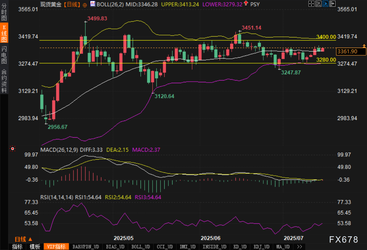 从日线图来看,黄金整体处于整理区间内震荡,上方阻力位在3400美元关口,下方支撑在3280美元一线。布林带收口明显,中轨位于3346.28,布林上轨在3413.24,布林下轨在3279.32,显示出波动率处于压缩状态,市场或在酝酿下一轮趋势性突破。