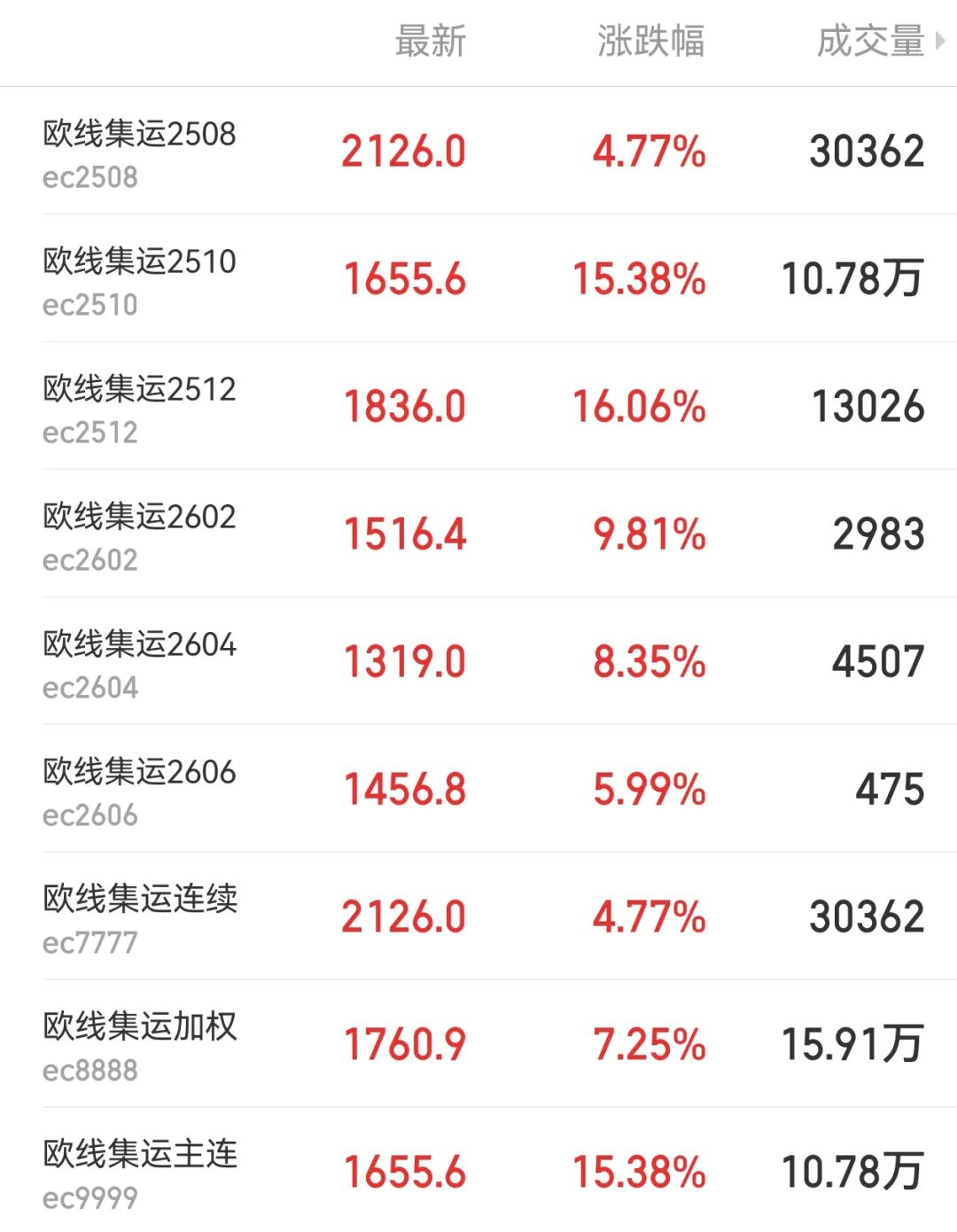 7月15日,集运指数(欧线)期货全线收涨。受主力移仓换月影响,新晋主力合约EC2510的表现尤为强势,当日收盘报1655.6点,上涨15.38%。现货市场方面,7月14日发布的SCFIS欧线指数报2421.94点,环比上涨7.3%,超出市场预期。
