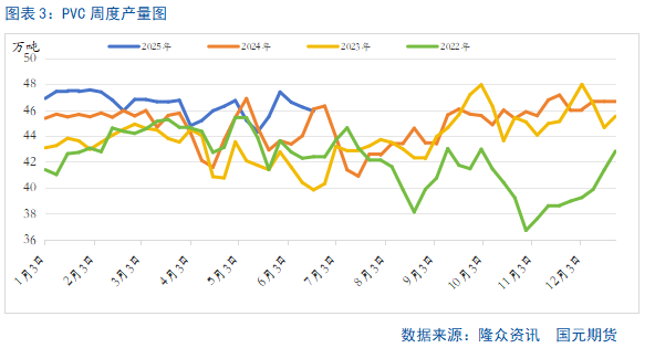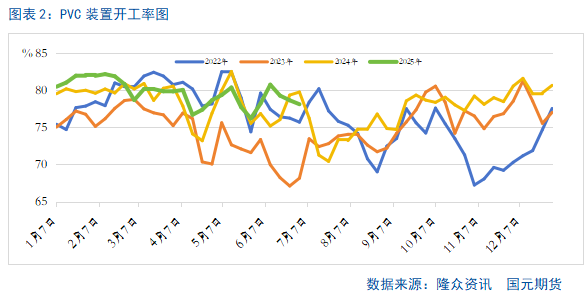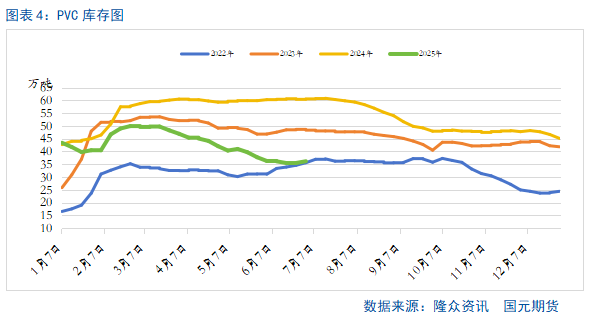 伴随着6月中下旬,国内有7套PVC装置集中检修,使得近期PVC的产能利用率呈现明显的回落。据统计,截至6月末,国内PVC的装置开工率在78.09%,较6月中旬回落了2.63个百分点,在此背景下,国内PVC周内产量达到45.92万吨,达到了6月以来的最低点,但是由于近几年新装置产能的投放,使得虽然装置开工率低于2024年同期,但是周度产量高于2024年同期。后期来看,7月份,国内PVC生产企业集中检修量相对较高,还有6套装置检修,与此同时,韩国LG化学其丽水年产65万吨的PVC工厂6月亦检修,台塑8月林园厂区大修。后期来看,产量将逐步下滑,来缓解供应端压力。不过值得一提的是,2025年上半年仅有陕西金泰榆林新厂区新增30万吨/年无汞化投产,而其余装置均推迟或在下半年试车量产。据市场消息,当前渤化发展40万吨装置和海湾化学20万吨装置将于7月投产,福建万华年产50万吨装置7月量产,此外,嘉化和甘肃耀望分别30万吨/年装置计划推迟至下半年择机试车。因此若后期新增产能投放,则供应端压力将持续走高。