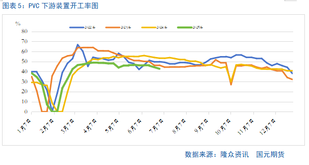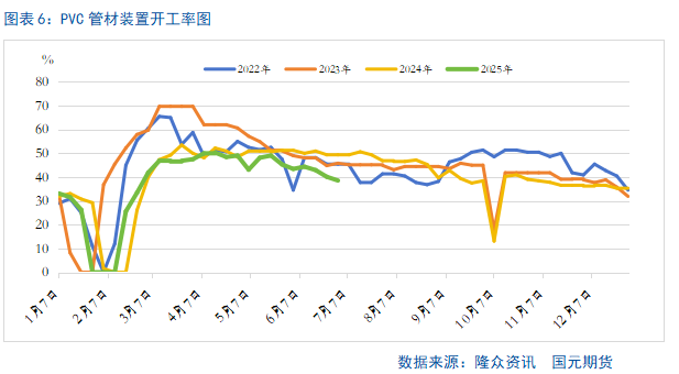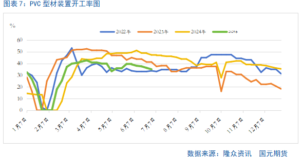 目前下游需求端已步入消费淡季,对上游采购有限,因此支撑力度下滑。从国内市场来看,当前下游制品企业订单一般,买跌不买涨,市场补库需求不佳,因此装置开工率位于近几年同期偏低水平。据悉,截至6月末,国内PVC下游综合开工率在42.78%,较6月初下滑了3.37个百分点,较去年同期相比下滑了10.54个百分点,且达到了2025年3月中旬以来的最低点。分品种来看,除了薄膜外,管材和型材的装置开工率均处于近三年同期低位,反映出对上游的需求乏力,进一步拖累盘面价格。从出口市场来看,虽然印度BIS认证延期6个月,但面临反倾销及雨季影响,出口环比增量有限,所以下游对PVC的支撑有限。