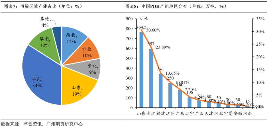 从产能的区域分布来看,山东地区丙烯现货交易极为活跃,堪称全国丙烯价格的风向标,其产能占比接近19%,涵盖了中石化、山东地炼、炼化一体化、PDH、甲醇制烯烃等多种工艺。此外,西北地区产能占比12%;华北地区占比10%;东北地区占比9%;华东地区占比34%;华南地区占比12%。